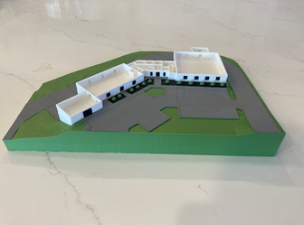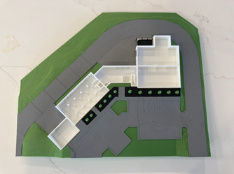 This model is a representation of a new warehouse/office space. Designed specifically to visualize how the building would sit on the surrounding land, this model serves its purpose with precision and accuracy. Measuring sixteen inches wide, the model allows for easy transportation between sites while still providing a detailed representation of both the exterior and interior.
